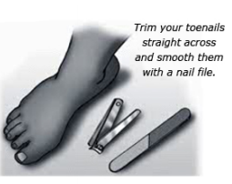 • Trim your toe nails carefully. Cut straight across and file the nail (figure 1). Do not cut cuticles or pop blisters.
